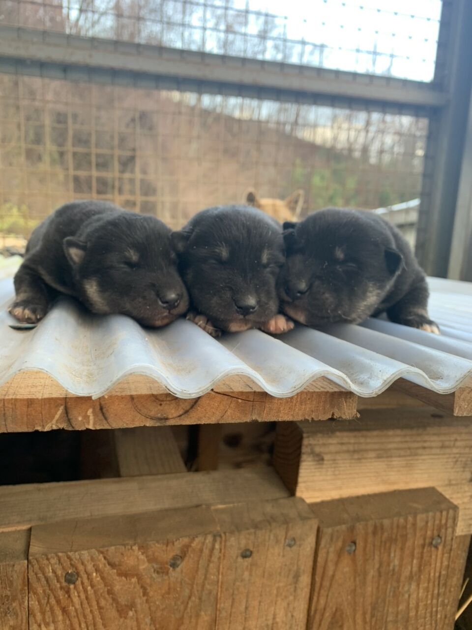 日中は先住犬のアイヌ犬舎でお目付役の獣猟参考犬の牝犬と自由に過ごさせています。