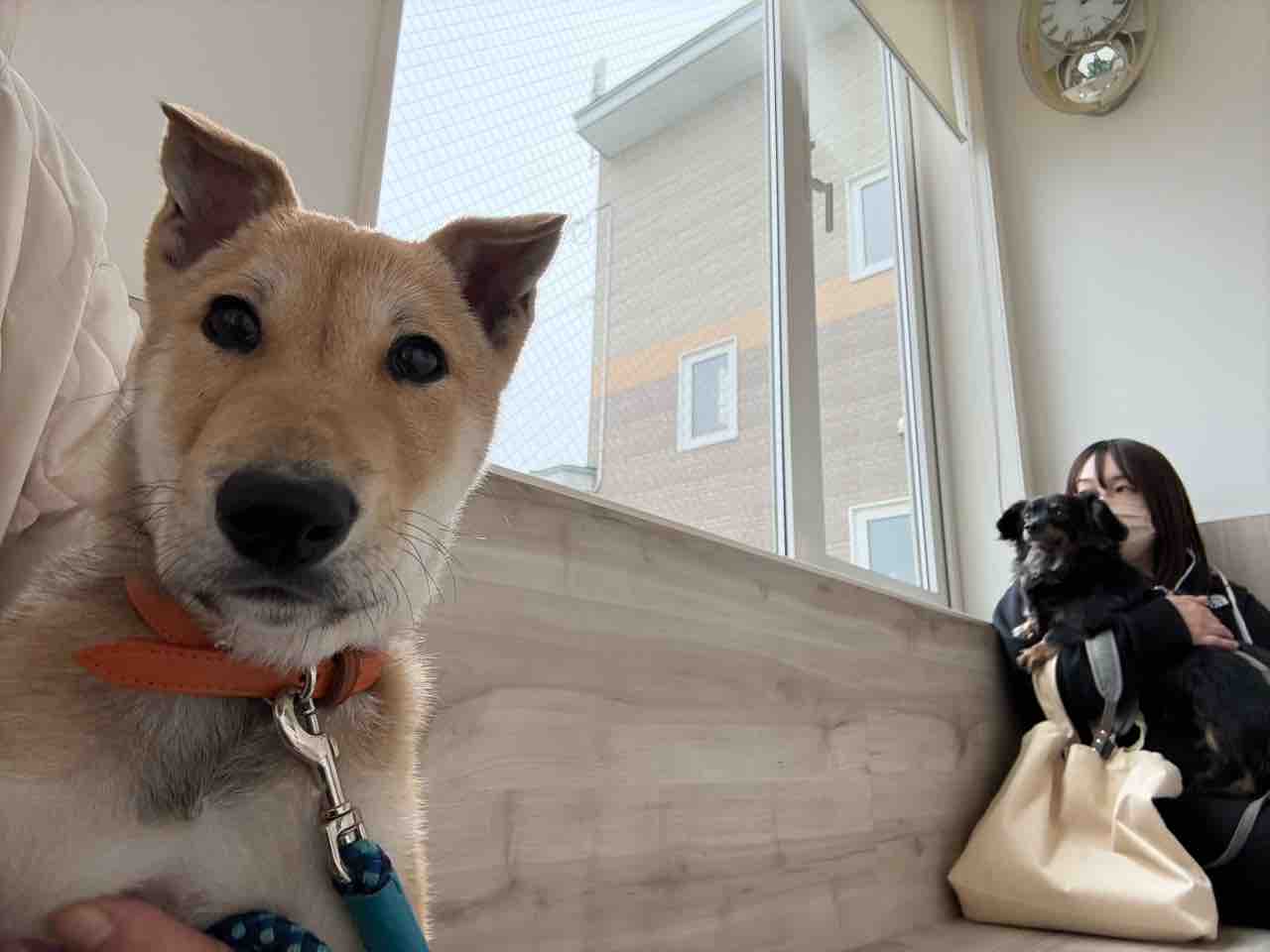 他のわんちゃんには興味津々ですが、人嫌いのイチ君にとってはしばらく慣れずに私の後ろに隠れたりしていましたが、大人しくお利口さんにしてくれ一安心!